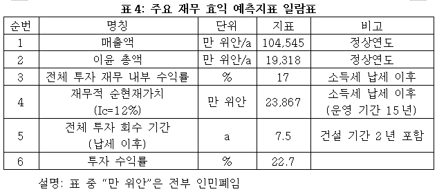 프로젝트가 설계 생산 능력의 생산량에 도달한 후 연간 매출액 104,545만 위안, 이윤 19,318만 위안, 투자 회수 기간 7.5년(납세 이후, 건설 기간 2년 포함), 투자 수익률은 22.7%이다.