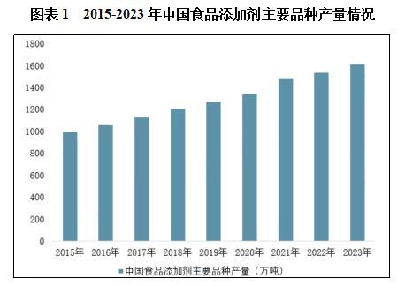 食品添加剂被誉为现代食品工业的灵魂,能够给食品工业带来许多好处,如防腐剂可以防止由微生物引起的食品腐败变质,延长食品的保存期;抗氧化剂则可阻止或推迟食品的氧化变质,以提供食品的稳定性和耐藏性;着色剂、香精香料等可明显提高食品的感官质量,满足人们的不同需要。凭借这些优势,食品添加剂在食品工业中的应用越来越广泛,已成为食品工业中最活跃、发展最快的行业之一。数据显示,2015年-2022年中国食品添加剂主要品种产量保持持续增长态势,2023年产量增长至1611万吨。