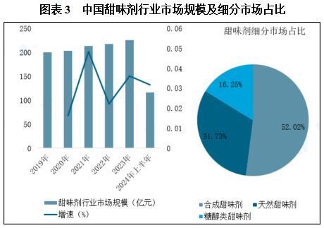 甜味剂是指能赋予食物甜味的食品添加剂。目前全球广泛使用的甜味剂有数十种,包括天然来源的和人工合成的。我国批准使用的二十种,都是世界上大部分国家和地区所批准使用的甜味剂,如阿斯巴甜、安赛蜜、糖精和甜蜜素等,都有长期安全使用的历史。近年来,随着人们健康意识的提高和对低糖、无糖食品需求的增加,中国甜味剂行业发展势头强劲。据统计,2023年中国甜味剂市场规模从2019年的200亿元增长至225.69亿元,2024年上半年同比增长3.16%至116.41亿元。从细分市场来看,2022年合成甜味剂占据市场份额的52.02%,天然甜味剂与糖醇类甜味剂分别以31.73%和16.25%的份额紧随其后。虽然目前合成甜味剂仍占据市场主导地位,但随着健康饮食理念的普及,天然甜味剂因其来源自然、健康影响较小而受到越来越多消费者的青睐。预计未来天然甜味剂的市场份额将持续上升,成为甜味剂市场的重要增长点。