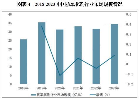 抗氧化剂,作为一类能够抵御氧气不良影响的特殊化学物质,在食品、医药、化妆品等多个领域都有广泛的应用。特别是在食品工业中,抗氧化剂以其独特的防止或延缓食品氧化的功能,大大提高了食品的保质期和稳定性,成为了不可或缺的食品添加剂。近年来,中国抗氧化剂行业市场规模呈现一定的波动性。2022年受国内外经济形势的变化、行业竞争加剧、消费者需求变化等因素影响,同比下降4.38%至31.65亿元。但2023年国内外市场需求的恢复,抗氧化剂市场规模又逐步上升,同比增长8.69%至34.4亿元。
