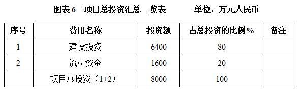 本项目总投资为8000万元,其中:建设投资6400万元,流动资金1600万元。