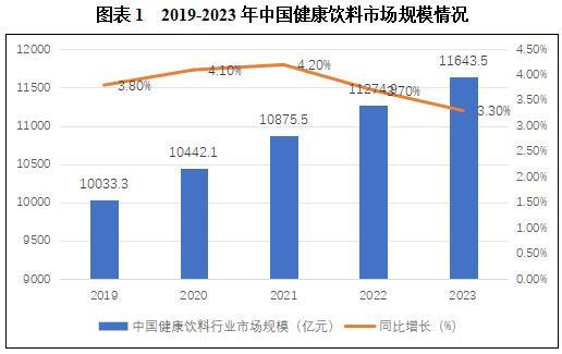 随着人们对健康生活的追求和对健康饮食的日益关注,健康饮料因其符合健康理念而备受青睐。消费者越来越注重饮料的营养成分和健康功能,如无糖、低糖、低脂等健康元素的饮料需求增加。根据尼尔森IQ调研数据显示,2019-2023年期间,中国健康饮料市场规模总体呈现出了持续增长态势,截至2023年底,中国健康饮料市场规模增长至为11643.5亿元,同比2022年期间增长3.3%。