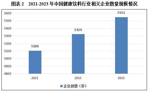 2021-2023年期间,随着中国健康饮料行业市场需求的持续增长,中国健康饮料行业供给规模在其市场需求带动下同样得到了进一步增长。根据企查查相关数据显示,2021-2023年期间,中国健康饮料行业相关企业数量规模呈现出持续增长态势,截至2023年底,中国健康饮料行业相关企业数量规模增长至5551家,同比2022年期间增长了227家。