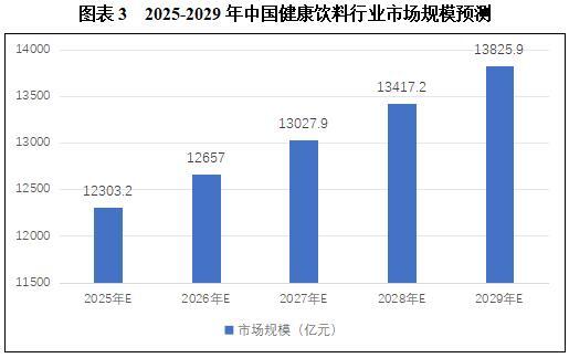 消费者对高品质、高附加值的健康饮料需求增加,将推动市场规模的扩大。加之,健康饮料行业不断推出新产品,满足消费者对口味、功能和包装等方面的多样化需求。产品创新和多样化将吸引更多消费者,进一步推动市场规模的增长。根据尼尔森IQ相关数据显示,预计2025-2029年,中国健康饮料行业市场规模将以2.9%的年复合增长率增长,预计至2025年底,中国健康饮料行业市场规模有望增长至12303.2亿元,至2029年底,中国健康饮料行业市场规模有望增长至13825.9亿元。