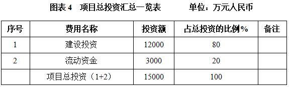 本项目总投资为15000万元,其中:建设投资12000万元,流动资金3000万元。