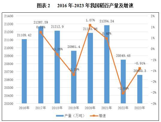 稻谷产量变化趋势随种植面积同步波动,近年来常年维持在2亿吨以上,得益于单产水平的提高,虽然近年来全国稻谷种植面积有所下降,但稻谷产量整体仍然维持增长趋势。2022~2023年间,受稻谷种植面积下降叠加极端气候等综合因素影响,中国稻谷产量连续两年呈现逐年下降趋势,但同比降幅略小于种植面积降幅。