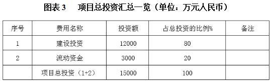 项目总投资为15000万元,其中建设投资12000万元,流动资金3000万元。