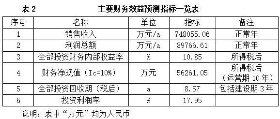 项目达产后,年销售收入748055.06万元,利润89766.61万元,投资回收期8.57年(税后,含建设期3年),投资利润率17.95%。