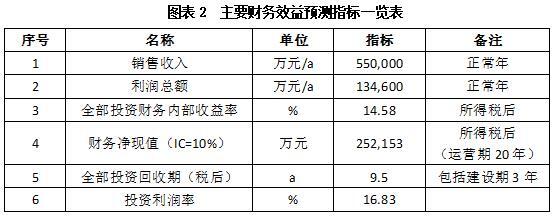 项目达产后,年销售收入550,000万元,利润134,600万元,投资回收期9.5年(税后,含建设期3年),投资利润率16.83%。
