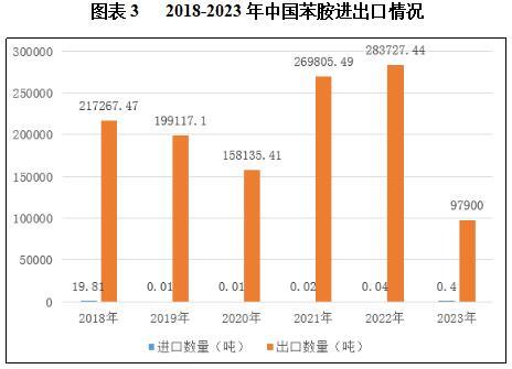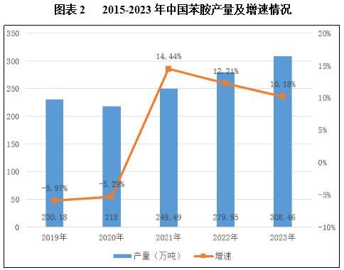 我国苯胺行业发展较为成熟。前些年受到MDI、橡胶助剂等下游需求拉动,苯胺行业产能迅速扩张,目前整体处于供大于求局面。行业产量自2018年呈小幅缩减态势,2020年我国苯胺行业产量为218万吨,同比下降5.29%。但是我国近几年来MDI发展较快,生产规模迅速扩张,产量有效扩大,国内的苯胺生产量也随之迅速扩张,2022年中国苯胺产量达279.95万吨,同比增长12.21%。2023年中国苯胺产量达308.46万吨,同比增长10.18%。