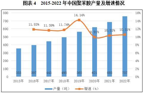 数据显示,2022年,我国聚苯胺行业产量757吨,同比增长10.51%,2015-2022年复合增长率为11.42%。