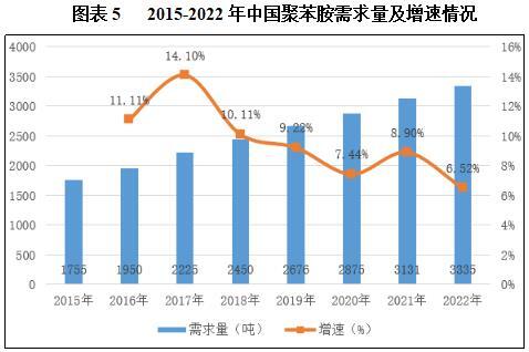 2022年,我国聚苯胺行业需求量3335吨,同比增长6.52%,2015-2022年复合增长率为9.61%。