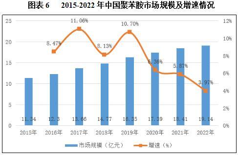 与此同时,我国聚苯胺行业市场规模在下游需求持续旺盛的趋势下而逐年递增。2015年以来,我国聚苯胺行业市场规模逐年递增,2022年中国聚苯胺市场规模达到19.14亿元,同比上升3.97%。