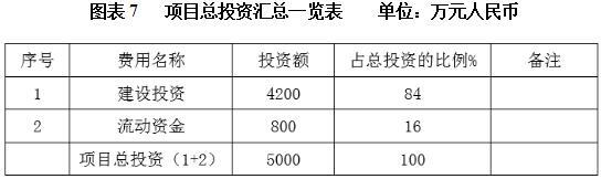 项目总投资为5000万元,其中建设投资4200万元,流动资金800万元。