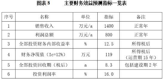 项目达产后,年销售收入1400万元,利润800万元,投资回收期8.3年(税后,含建设期2年),投资利润率16.0%。