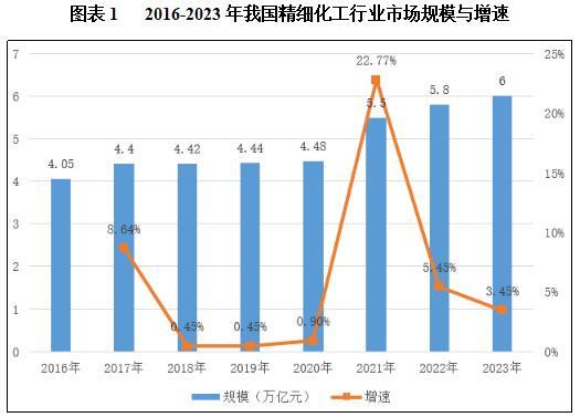 我国的精细化工市场规模呈现稳步上涨趋势,数据显示,2022年,我国精细化工行业总产值约为5.8万亿元,同比增长5.45%,占化工行业总产值的比重达到43.7%。2023年,随着国内外经济复苏和精细化工产品需求增加,我国精细化工行业保持了较快的增长势头,全年总产值达到6万亿元,同比增长3.45%,占化工行业总产值的比重提高到44.2%。预计2025年将达到6.6万亿元。我国计划到2025年将精细化工率提高到55%,这一目标体现了对精细化工行业发展的重视和预期。