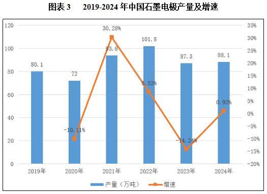 近年来,钢铁、电解铝、工业硅等产业的快速发展带动了石墨电极产量不断增加。数据显示,2024年中国石墨电极产量达88.1万吨,同比增长0.92%。未来随着国内政策对电弧炉短流程炼钢取代转炉炼钢的支持和引导,石墨电极产量将继续增长。