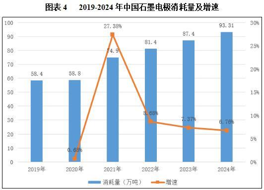 随着下游产业需求的增加,近年来我国石墨电极消耗量不断增长。数据显示,2022年中国石墨电极消耗量达81.4万吨,较上年增长8.68%,2023年约为87.4万吨。2024年中国石墨电极消耗量达到93.31万吨。