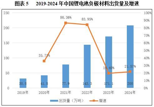 受益于国内外新能源汽车等终端市场增长拉动,我国锂电池相关行业发展快速,负极材料市场需求增大。数据显示,2023年中国负极材料出货量达到171.1万吨,同比增长19.4%,全球占比进一步提升至94.1%。2024年出货量保持增长,达到208万吨。