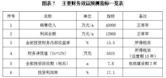 项目达产后,年销售收入43000万元,利润12000万元,投资回收期7.8年(税后,含建设期2年),投资利润率17.1%。