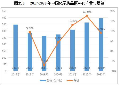 在2013-2017年间中国原料药的产能整体呈增长趋势;但在2018-2019年受环保安全监管趋严以及供给改革不断深化的影响,一些高能耗、高污染、工艺技术落后、过剩的原料药产能被淘汰,中国原料药产能下降明显;2020年,尽管全球疫情的冲击使得原料药市场增长略显迟缓,但随着我国疫情防控形势的逐步稳定以及全球经济的复苏,原料药行业迅速恢复了生机,展现出强大的发展势头。到了2023年,我国原料药产能已跃升至394.9万吨,同比增长了8.91%,这一数字不仅彰显了我国原料药产业在历经风雨后的崭新风貌,更预示着其未来巨大的发展潜力。