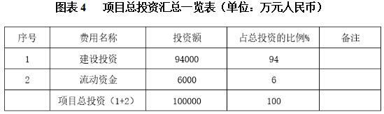 项目总投资为100000万元,其中建设投资94000万元,流动资金6000万元。