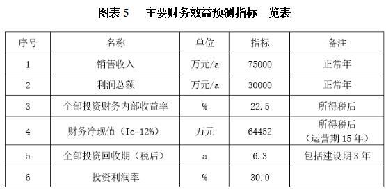 项目达产后,年销售收入75000万元,利润30000万元,投资回收期6.3年(税后,含建设期3年),投资利润率30.0%。