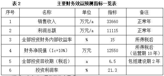 项目达产后,年销售收入33660万元,利润11115万元,投资回收期6.5年(税后,含建设期2年),投资利润率21.3%。