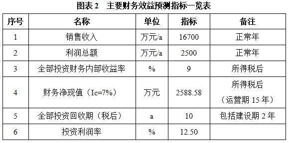 项目达产后,年销售收入16700万元,利润2500万元,投资回收期10年(税后,含建设期2年),投资利润率12.50%。