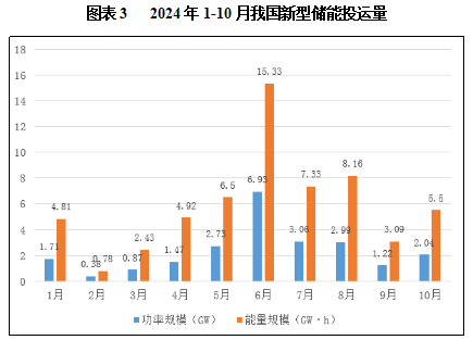 截至2024年10月底,2024年中国新型储能市场累计装机量为23.42GW/58.86GW·h,累计同比增长118% (按能量规模统计),项目投运规模较去年同期翻倍,整体增速可观且行业持续向好并逐步成熟。其中2024年10月新型储能新增装机量为2.04GW/5.50GW·h,环比增加82%( 按能量规模统计),同时规模仍较去年同期增长236%(按能量规模统计)。