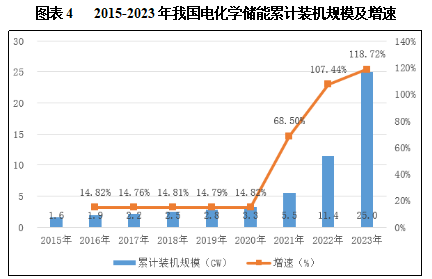 截至 2023 年底,全国电力安委会 19 家企业成员单位总计报送各类电化学储能电站 1375 座、总功率 45.43GW、总能量 92.61GW·h,其中累计投运电站 958 座、总功率 25.00GW、总能量 50.86GW·h (在运 863 座、总功率 24.35GW、总能量49.62GW·h,停用 95 座、总功率 0.65GW、总能量 1.25GW·h) ,在建电站 417 座、总功率 20.43GW、总能量 41.75GW·h。2023年新增投运电化学储能电站 486 座、总功率 18.11GW、总能量 36.81GW·h,超过此前历年累计装机规模总和。