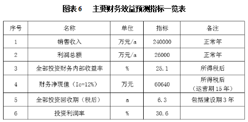 项目达产后,年销售收入240000万元,利润26000万元,投资回收期6.3年(税后,含建设期3年),投资利润率30.6%。