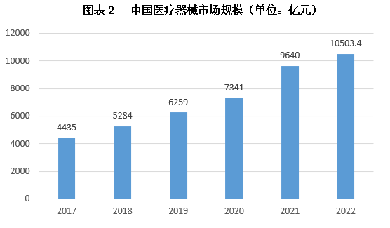 中国是全球第二大医疗器械市场,数据显示,2017-2022年我国医疗器械行业市场规模不断增加,从4435亿元增长至10503.4亿元。中国物流与采购联合会医疗器械供应链分会11月26日发布的行业发展报告显示,2023年我国医疗器械工业市场规模达1.25万亿元,同比增长16%。长期来看,居民医疗保健意识的增强叠加政策引导支持力度的加大,医疗器械市场终端需求将持续释放,市场前景广阔。