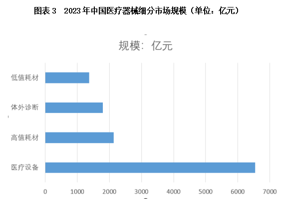 2023年中国医疗器械细分市场规模最大的是医疗设备市场,市场规模为6547.71亿元,占整体医疗器械产业的55.3%。其次是高值耗材、体外诊断低值耗材,分别占整体医疗器械产业的比重为18.0%、15.2%、11.5%。国产医疗器械行业的技术不断更新,产业链发展也日趋成熟,整个行业处在高速发展的黄金时期。