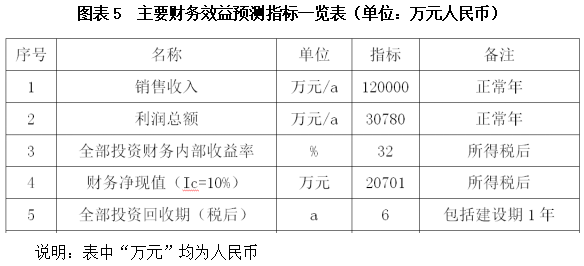 项目建成后,年销售收入120,000万元,利润30,780万元,投资回收期6年(税后,含建设期1年)。