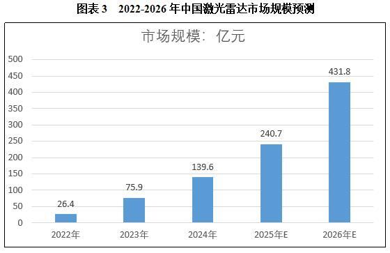 受无人驾驶车队规模扩张、高级辅助驾驶中激光雷达应用渗透率提升以及机器人及智慧城市建设等领域需求的推动,中国激光雷达市场驶入快车道。2023年中国激光雷达市场规模约为75.9亿元。预计2026年将达到431.8亿元。