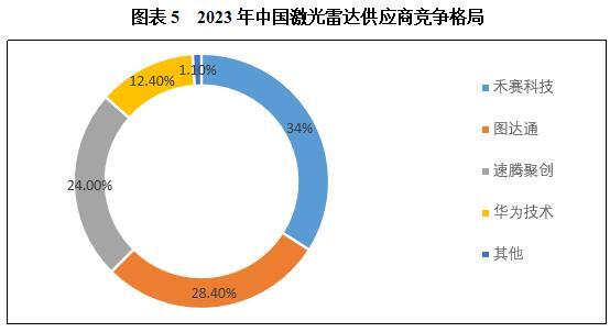 2023年激光雷达行业市场集中度较高,行业竞争激烈。头部企业中,禾赛科技以34%的市场份额稳居激光雷达行业榜首;图达通依靠蔚来汽车的持续出货,以28.4%的市场份额夺得第二名。此外,速腾聚创、华为技术的市场份额分别为24.0%、12.4%。