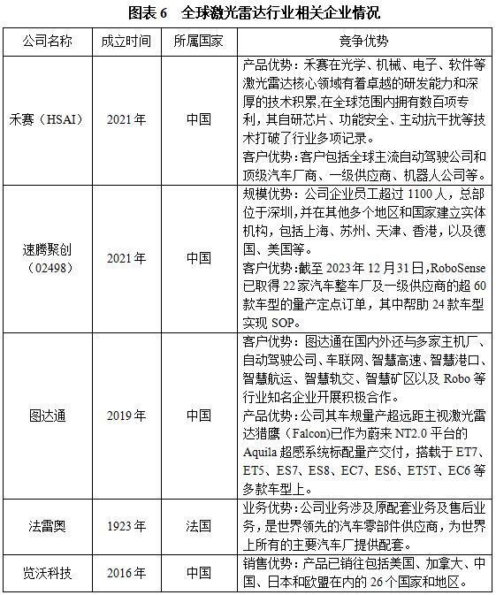 企业方面,全球激光雷达相关企业主要有禾赛(HSAI)、速腾聚创(02498)、图达通、法雷奥和览沃科技等企业,其竞争优势对比如下: