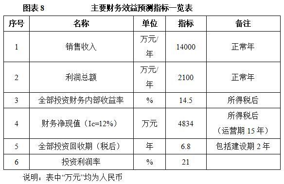 项目达产后,年销售收入14000万元,利润2100万元,投资回收期6.8年(税后,含建设期2年),投资利润率21%。