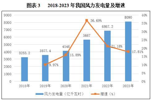 我国在风电技术研发和生产方面不断增加投入、提升技术水平和产能,已成为全球领先的风电制造国家。中国作为全球最大的风电市场,陆上风电及海上风电均蕴藏较大潜力,且近年来发展较为迅速,2022年我国风电发电量已达6867.2亿千瓦时,同比增长21.18%。2023年,全国风电发电量8090亿千瓦时,同比增长17.81%。