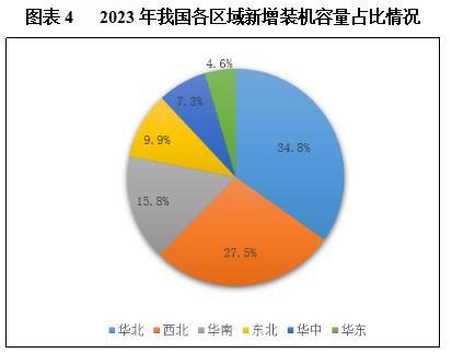 2023年,全国六大区域的风电新增装机容量占比分别为华北34.8%、西北27.5%、华南15.8%、东北9.9%、华中7.3%、华东4.6%。三北地区新增装机容量占比为72%,中东南部地区新增装机容量占比达到28%。