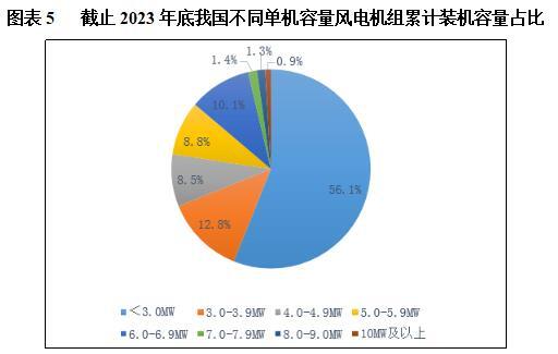截至2023年底,3.0MW以下(不含3.0MW)风电机组累计装机容量占比从2022年的67.3%下降到56.1%;3.0MW至5.0MW(不含5.0MW)风电机组累计装机容量占比为21.3%,比2022年下降了约1个百分点;5.0MW及以上风电机组累计装机容量占比达到22.6%,比2022年增长了约10个百分点。