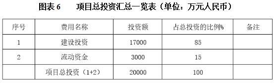 项目总投资为20000万元,其中建设投资17000万元,流动资金3000万元。
