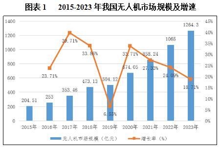 2023年国内无人机市场规模约为1264.3亿元,同比增长18.71%,2015-2023年复合年增长率高达64.78%。