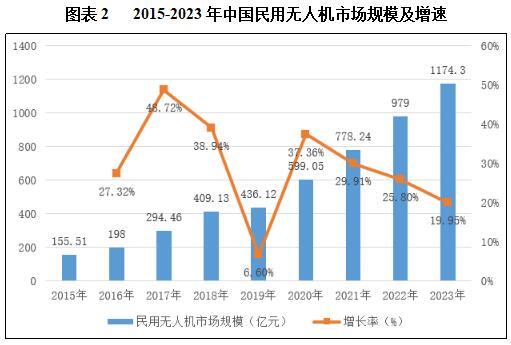 2023年国内民用无人机市场规模约为1174.3亿元,同比增长19.95%,2015-2023年复合年增长率高达81.89%。