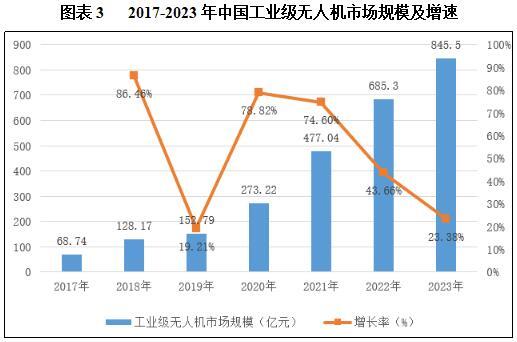 2023年国内工业级无人机市场规模约为845.5亿元,同比增长23.38%,2017-2023年复合年增长率高达188.33%。