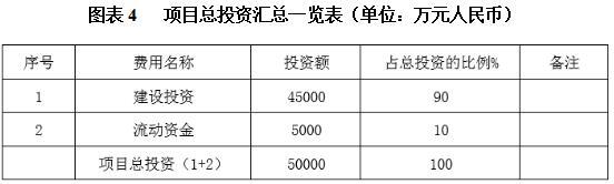 项目总投资为50000万元,其中建设投资45000万元,流动资金5000万元。