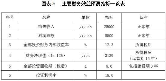 项目达产后,年销售收入25000万元,利润8500万元,投资回收期8.6年(税后,含建设期3年),投资利润率18.0%。