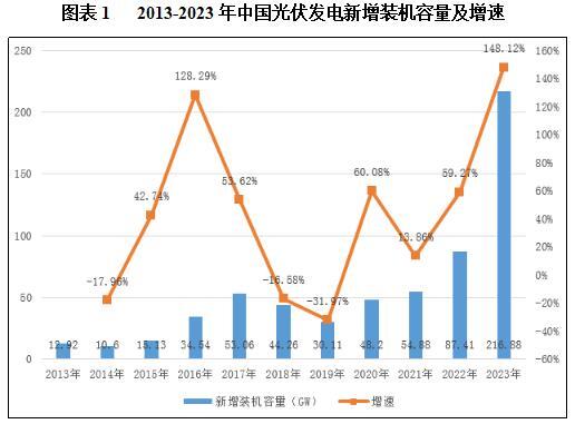 根据国家能源局数据,2020年到2023年光伏装机量大幅回升。2021年,中国光伏新增装机量为54.88GW,同比增长13.86%。2022年我国光伏发电新增装机量达到87.41GW,同比增长59.27%。2023年我国光伏发电新增装机量再创新高,达到216.88GW,同比增长148.12%。这一数据在2013年仅为12.92GW,2013-2023年年均复合增速达43.95%。