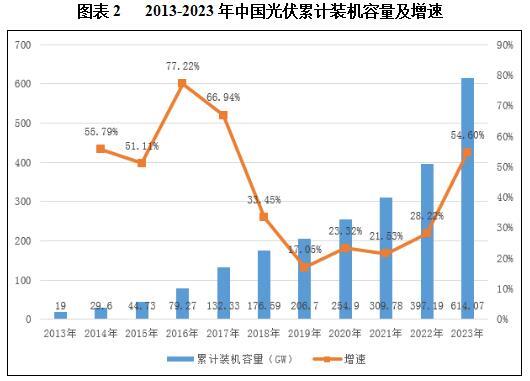 根据国家能源局数据,截至2023年,我国光伏累计装机容量达614.07GW,同比增长54.6%。而这一数据在2013年仅为19GW,2013-2023年年均复合增速达42.92%。光伏产业在国家战略以及市场需求的共同作用下呈现出蓬勃的发展态势。